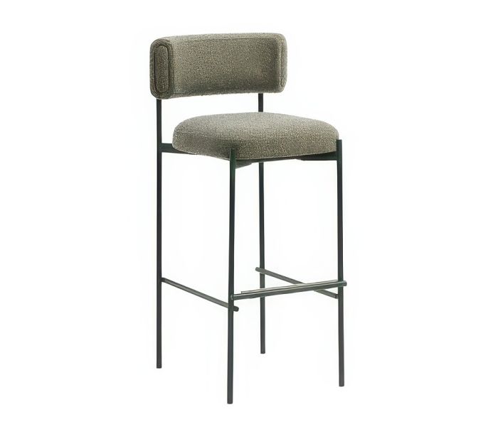The Amelie stool features a sturdy four-legged metal base. The backrest and seat are upholstered in your choice of leather, faux leather, or fabric.