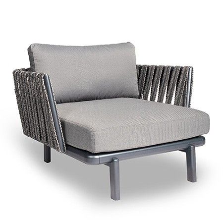 Single seat with a lacquered aluminum frame, cushions, and upholstery designed for outdoor use, featuring a backrest with braided passageway tape on an aluminum tube. Offers a wide selection of colors and combinations, with optional cushions available. Ideal for outdoor settings.