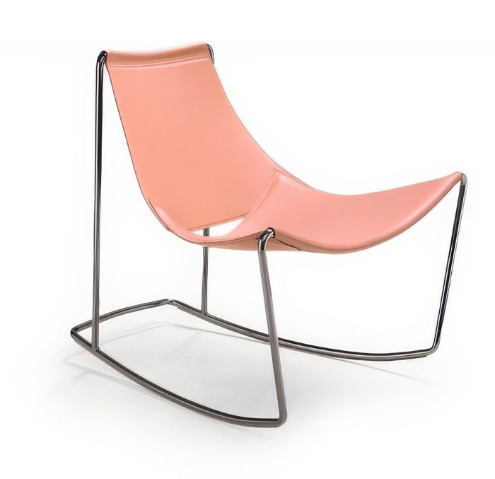 The Apelle rocking chair features a metal base with a seat crafted from hide or Tuscan hide.
