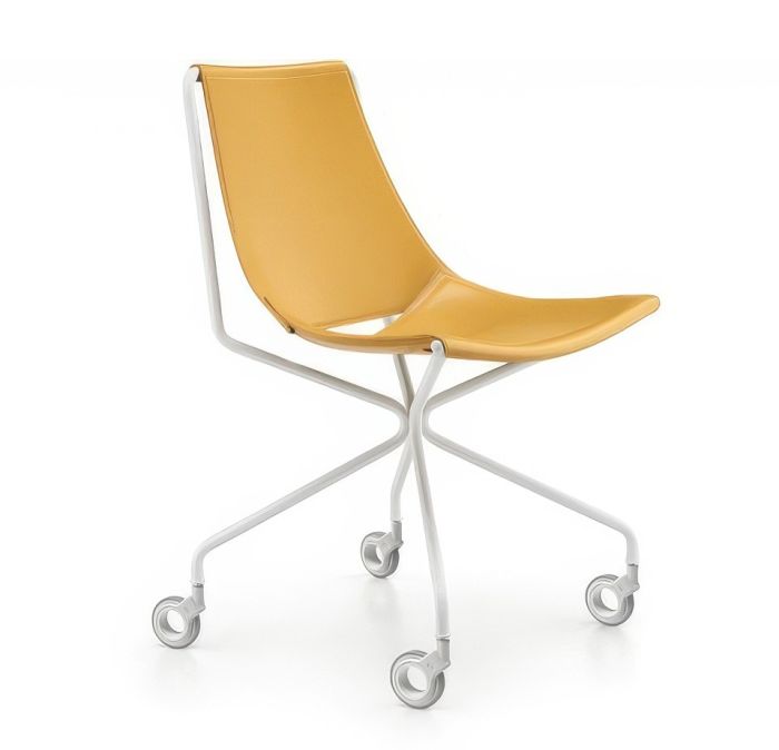 The Apelle chair features a four-leg base made of lacquered metal, with a seat and backrest crafted from hide or Tuscan hide.