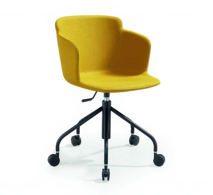 Calla office chair, swivel and height-adjustable, with armrests. Features a five-way lacquered metal base on wheels and a seat upholstered in leather, faux leather, or fabric. This chair is also available without armrests, or in polypropylene, either with or without armrests.