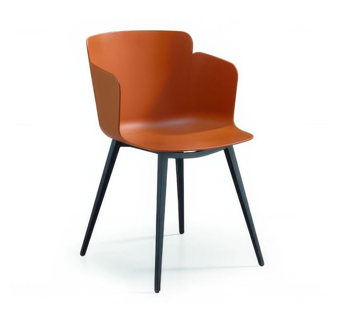 Features a polypropylene shell and a four-legged lacquered metal base.