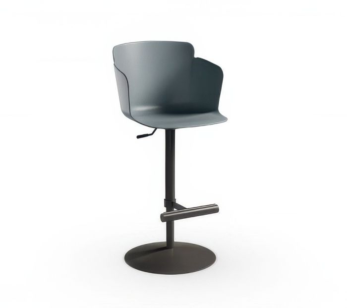 Calla stool with swivel and height-adjustable features, including armrests. It has a metal base and a polypropylene seat.