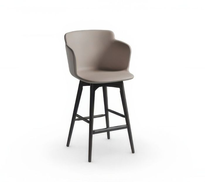 Fixed Calla stool with armrests, featuring a lacquered ash wood base and seating upholstered in fabric, leather, or faux leather.