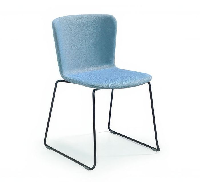 Calla stackable chair with a sled metal base. The seat is upholstered in leather, faux leather, or fabric.