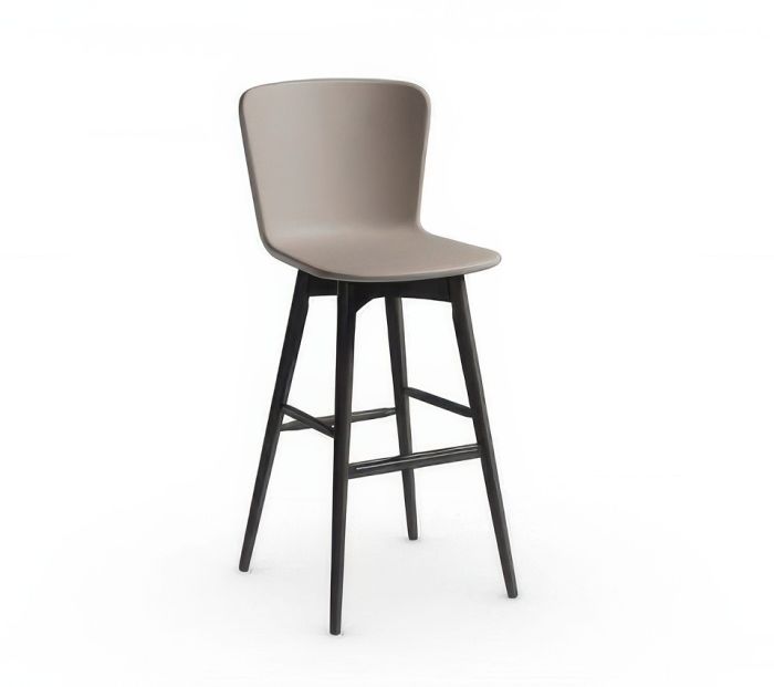 Fixed Calla stool with a lacquered ash wood base and seating upholstered in fabric, leather, or faux leather.
