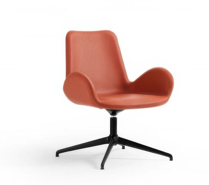 Dalia lounge armchair with a metal swivel base on a trestle. The seat is upholstered in fabric, leather, or faux leather.