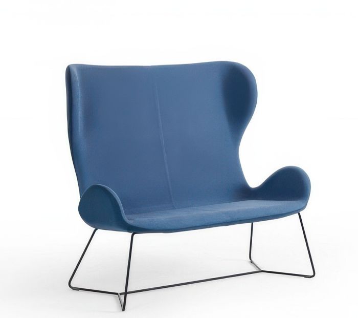 Dalia two-seater sofa features a high backrest and a metal base. The seating is available in leather, faux leather, or fabric upholstery. The front and back of the backrest can be customized with a variety of materials and colors. Optional: headrest cushion available.