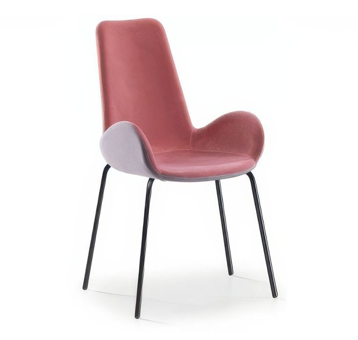 Dalia armchair featuring a high backrest and a four-leg base available in lacquered or chrome metal. The seat is upholstered in your choice of leather, faux leather, or fabric.