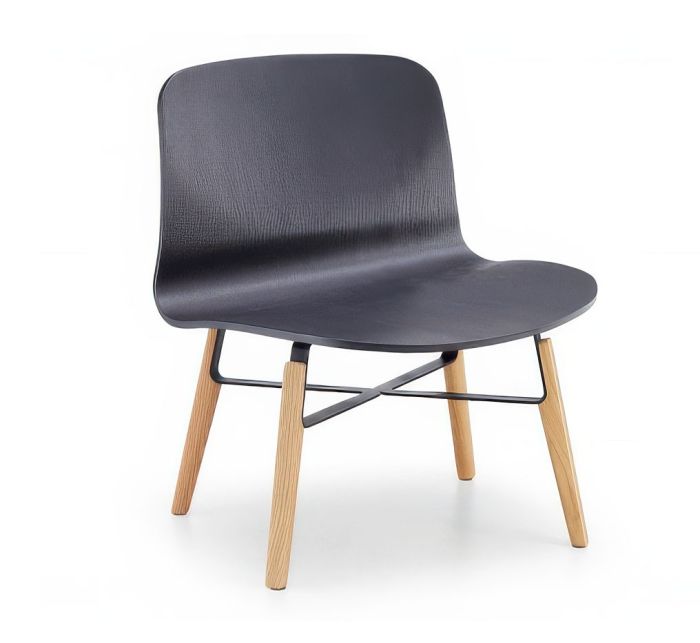Lounge Liù with a four-legged wooden frame featuring lacquered metal inserts and a wooden shell.