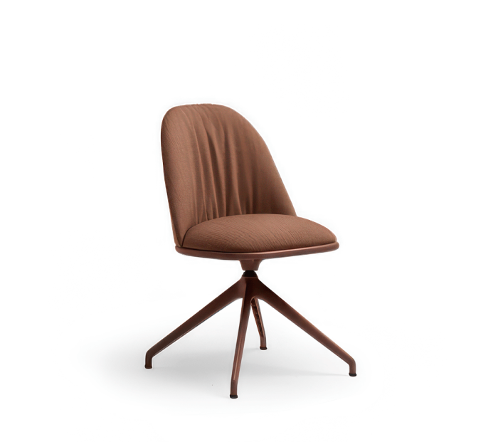 Lea Deluxe chair with a fixed metal trestle base and a self-return mechanism. The seat and backrest are upholstered in fabric, leather, or faux leather, with options to customize the front and back in different fabrics or colors.