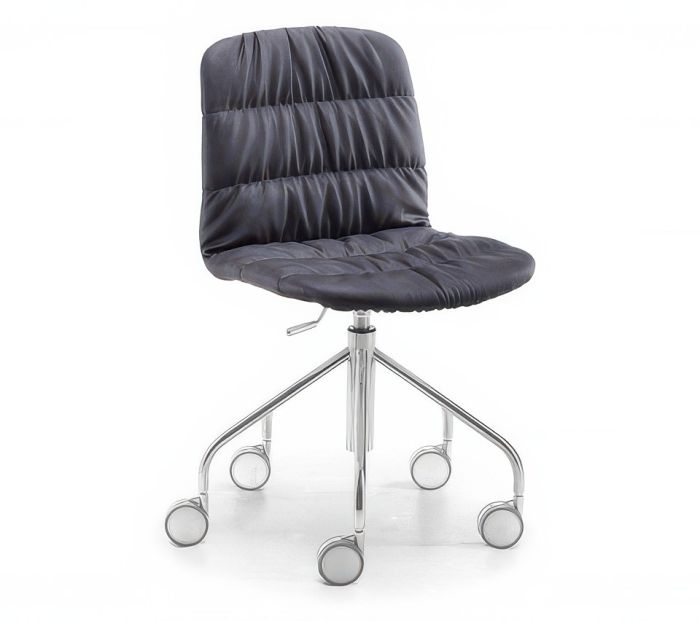 Liù office chair with a five-way base on wheels, swivel and height-adjustable features. The shell is upholstered in fabric, faux leather, and leather, featuring distinctive "wrinkled" detailing.