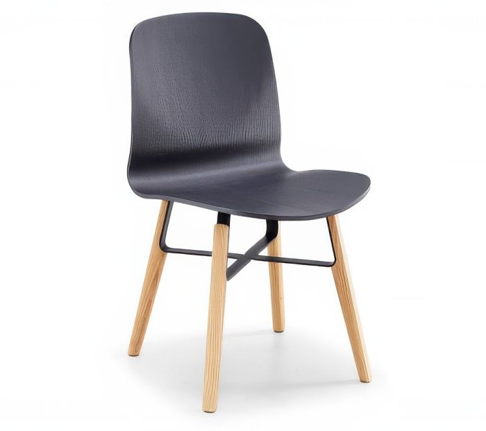Liù chair featuring a four-leg wooden base with a lacquered metal insert and a wooden shell.