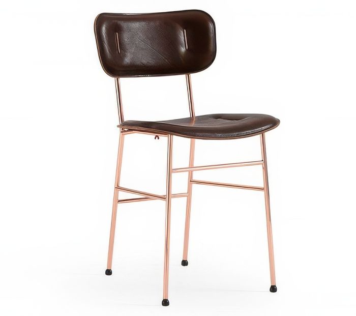 Piuma chair with a four-leg metal base. Seat and back are available in hide or Tuscan hide, featuring metal inserts that match the structure, with black metal wing nuts. The Piuma collection includes chair, armchair, and stool versions, with seat and back options in wood, hide, leather, fabric, or faux leather.