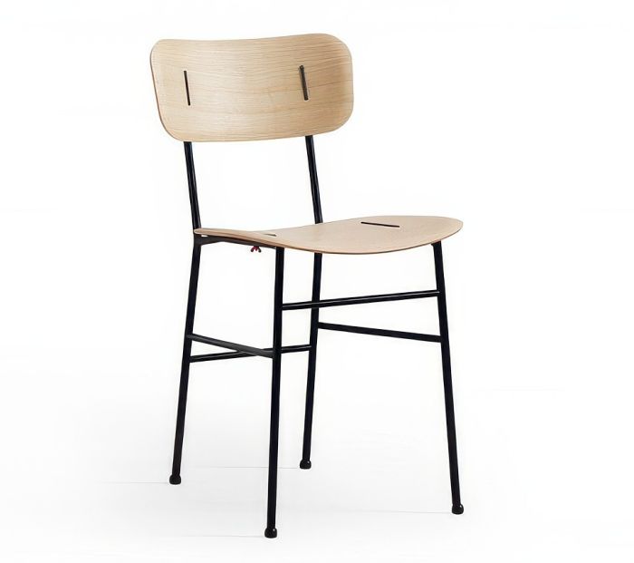Seat and backrest are available in ash, walnut, or oak veneered wood, featuring metal inserts that match the structure, with black metal wing nuts.
