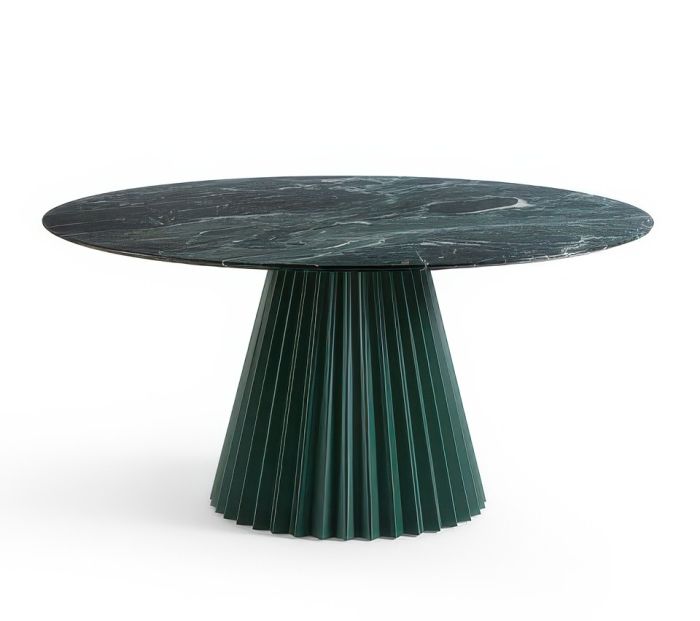 Plissé is a fixed table featuring a central lacquered metal base and a round top available in veneered wood, crystalceramic, and marble (note: the ø180 size is not available with a crystalceramic top).