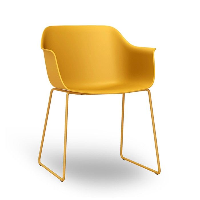 Compact armchair designed for indoor use, featuring a frame made from injected polypropylene with fiberglass. The legs are crafted from painted steel. The entire chair, including body and structure, is unified in color.
