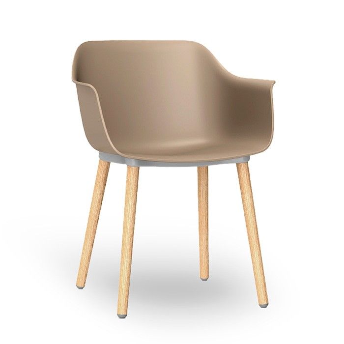 Indoor armchair featuring a seat frame and leg structure made from polypropylene and fiberglass. This chair includes wooden legs and utilizes a clip-on assembly system. It also offers UV protection.
