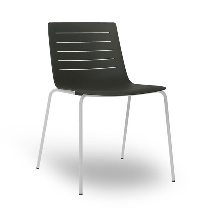 Chair designed for indoor use, crafted from injected polypropylene and fiberglass. It features a structure made of painted steel.