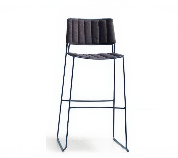 Slim stool, available in H65 or H75 versions with a metal sled base, features a seat and backrest upholstered in leather, faux leather, or fabric. Stools are stackable up to four units.