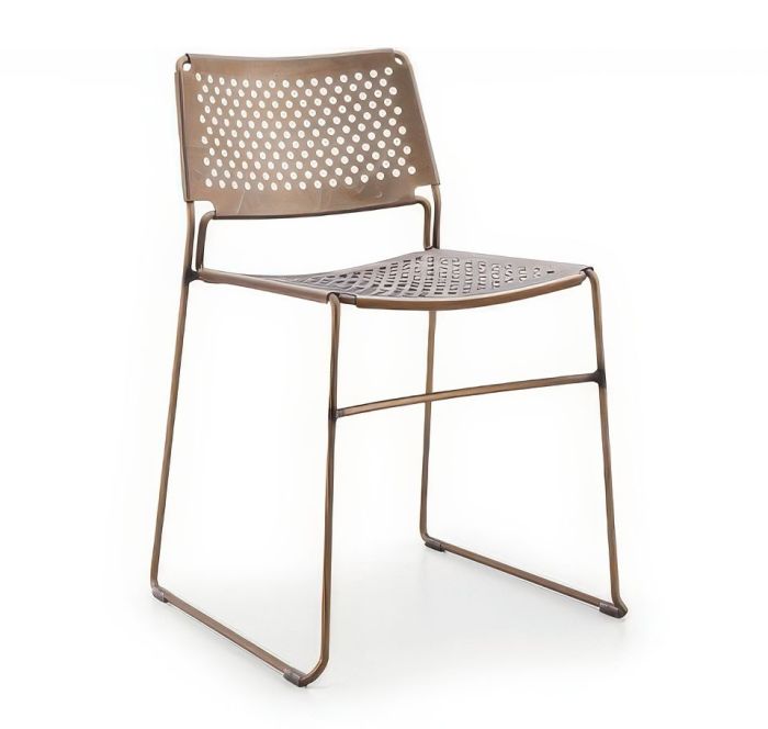 Slim chair with sled base, suitable for both indoor and outdoor use.