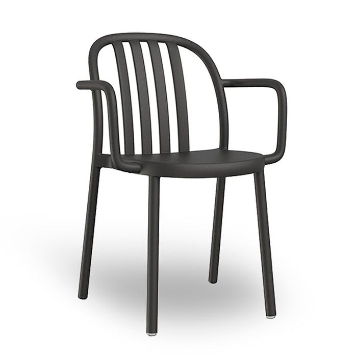 Chair designed for both indoor and outdoor use, injection-molded from polypropylene and fiberglass. Stackable and equipped with UV protection.