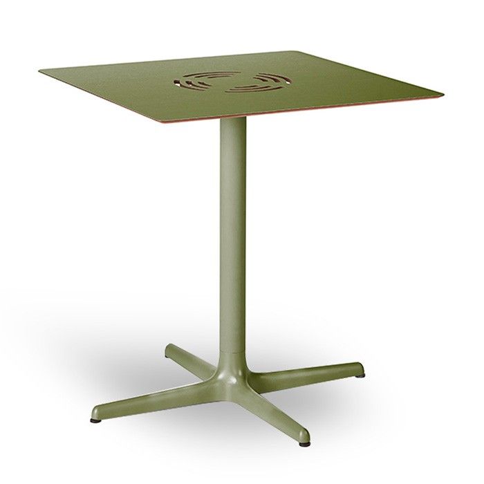 Table suitable for both indoor and outdoor use, featuring a painted aluminum structure with a matching HPL tabletop in the same color.