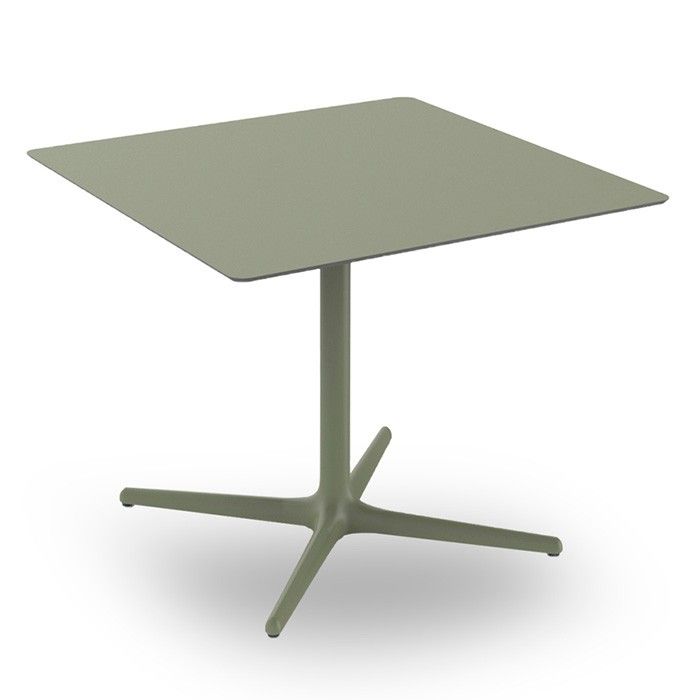 Table designed for both indoor and outdoor settings, featuring a painted aluminum base and a high-pressure laminate (HPL) tabletop in the same color.