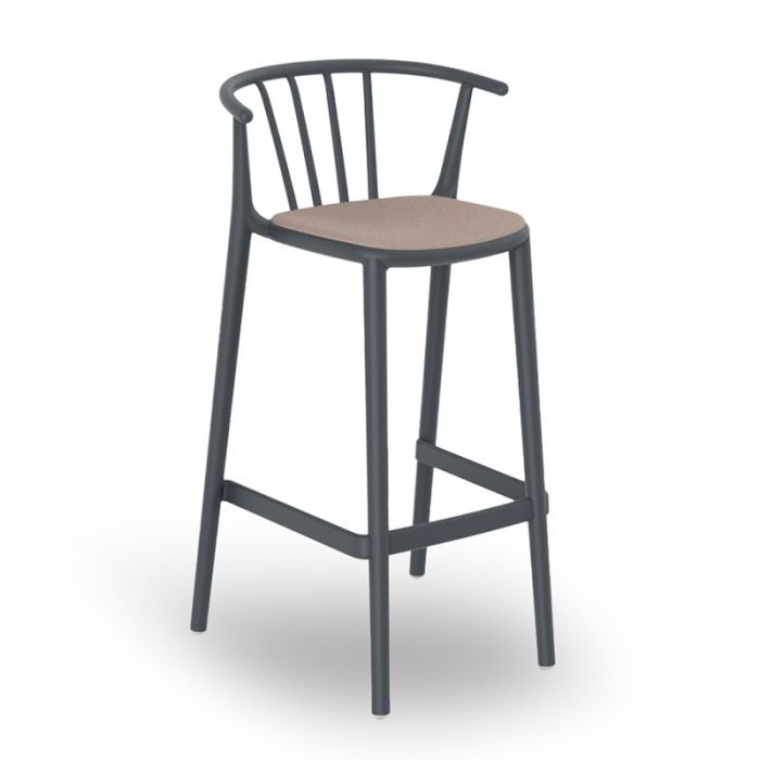 Stool designed for both indoor and outdoor use, made from fiberglass-reinforced polypropylene with UV protection. Features quick-drying foam and upholstery suitable for indoor and outdoor environments, with a fabric weight of 275 g/m².